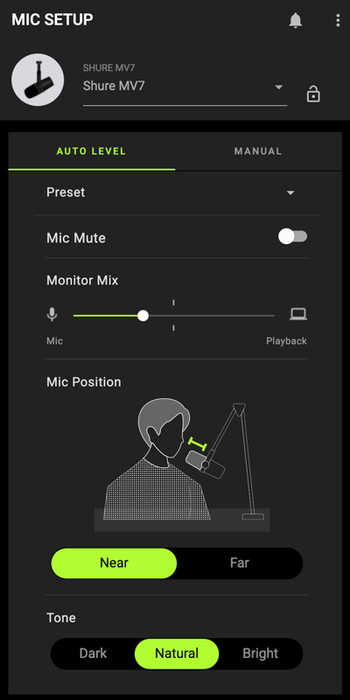 Quando colleghi l'MV7 tramite USB, l'app gratuita ShurePlus MOTIV fa un ottimo lavoro nel calibrare il microfono, così puoi iniziare subito a lavorare con un suono solido. Se selezioni semplicemente "Auto Level", tutto ciò che devi fare è far sapere all'app se il microfono è montato vicino (1-6 pollici) o lontano (6-18 pollici) e se desideri che la tua voce abbia un tono scuro, naturale o luminoso.