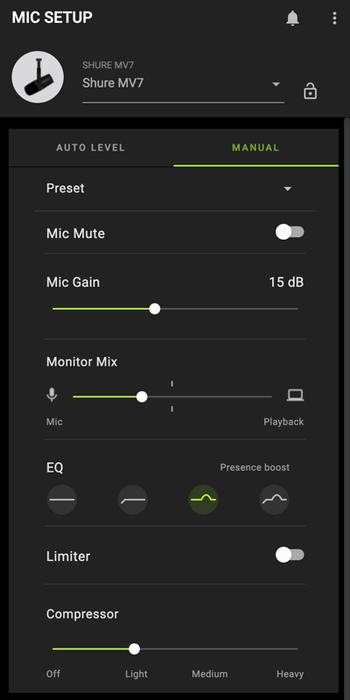 Scegliendo "Manuale" puoi collegare le cuffie e avere un controllo più attivo. Puoi impostare il guadagno, scegliere un'impostazione dell'equalizzatore per regolare il volume di determinate bande di frequenza, attivare il limitatore per evitare picchi improvvisi di volume e aumentare il compressore per ridurre l'intervallo tra gli elementi più deboli e più forti di un segnale audio, quindi salvare il tutto in un preset.